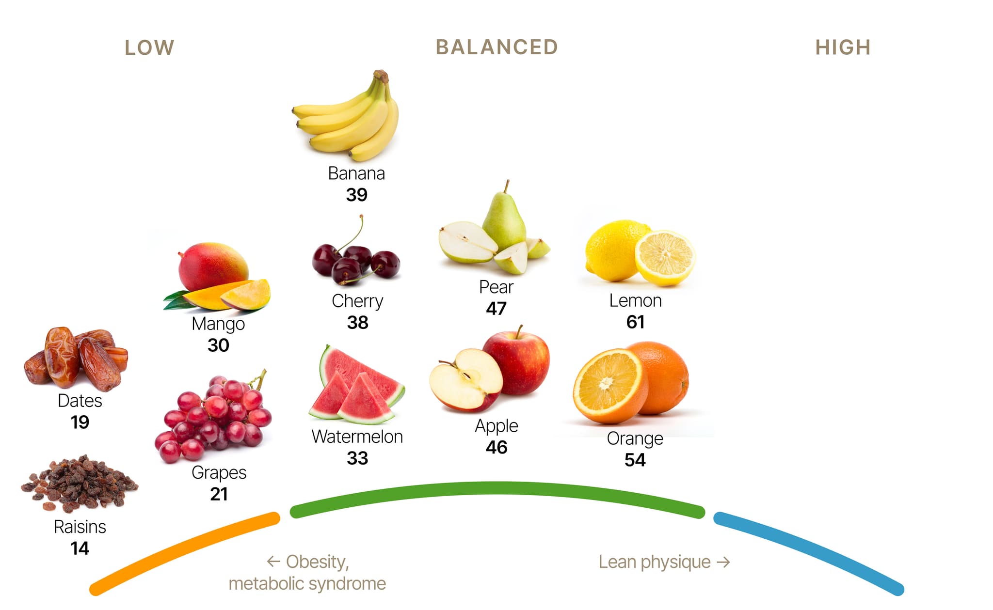 As you might have guessed, dried fruits score lower, as they are more concentrated and faster to consume. For example, dry grapes and you get raisins that score 14.