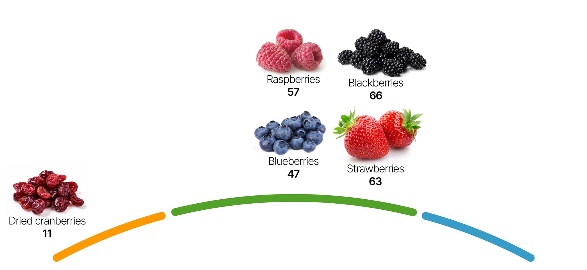 Berries score slightly higher than most fruit, especially raspberries (57), strawberries (63), and blackberries (66).