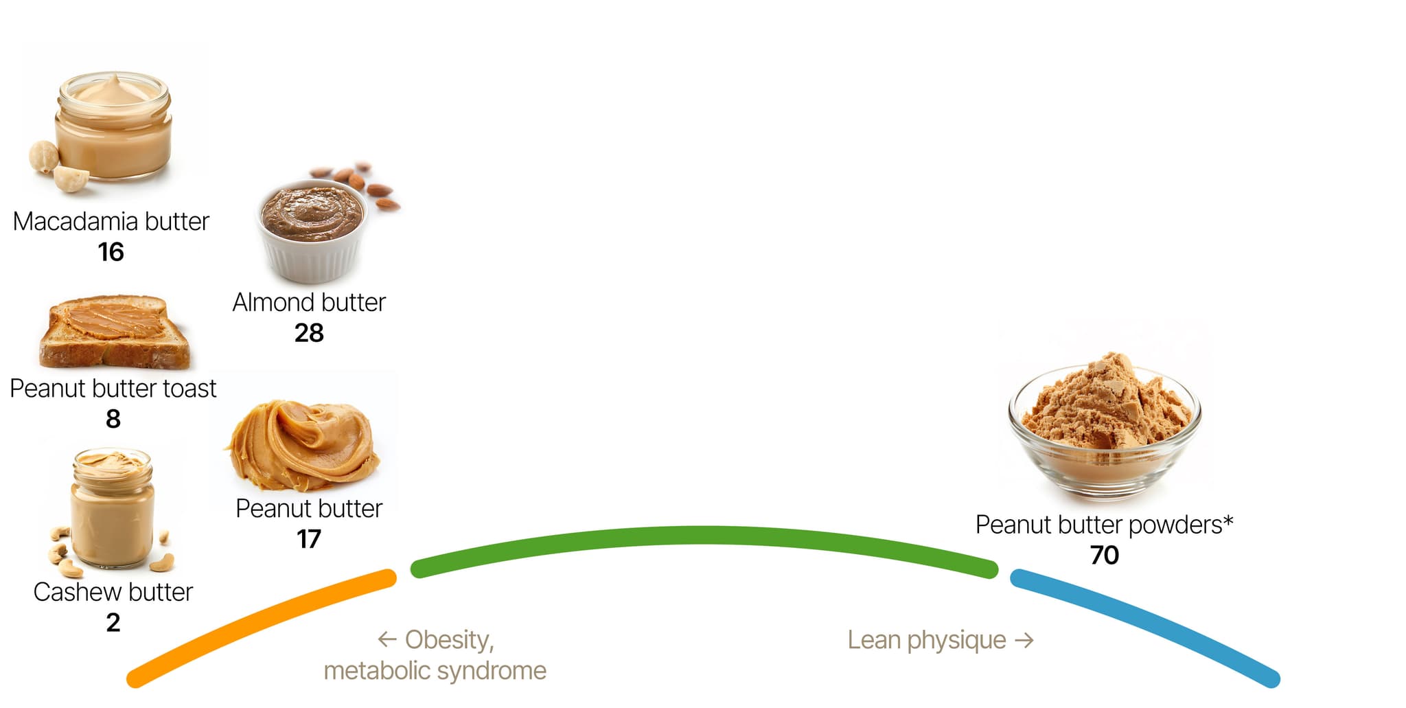 Generally speaking, nut butters – e.g., peanut butter – score slightly lower than the nuts they come from. They generally contain less fiber, are more energy-dense, and often have added salt. Salted high-fat foods like this are hedonic, driving overeating.
