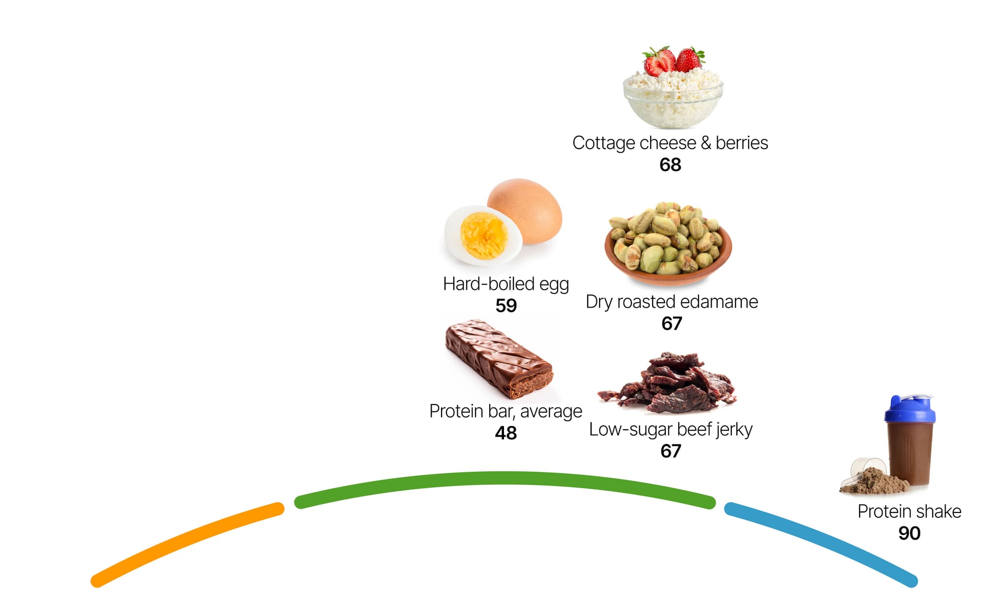 Even higher in our Hava satiety scoring: beef jerky (regular brands with added sugar score about 59, low-sugar brands about 67), dry roasted edamame (68), or cottage cheese with berries (68).