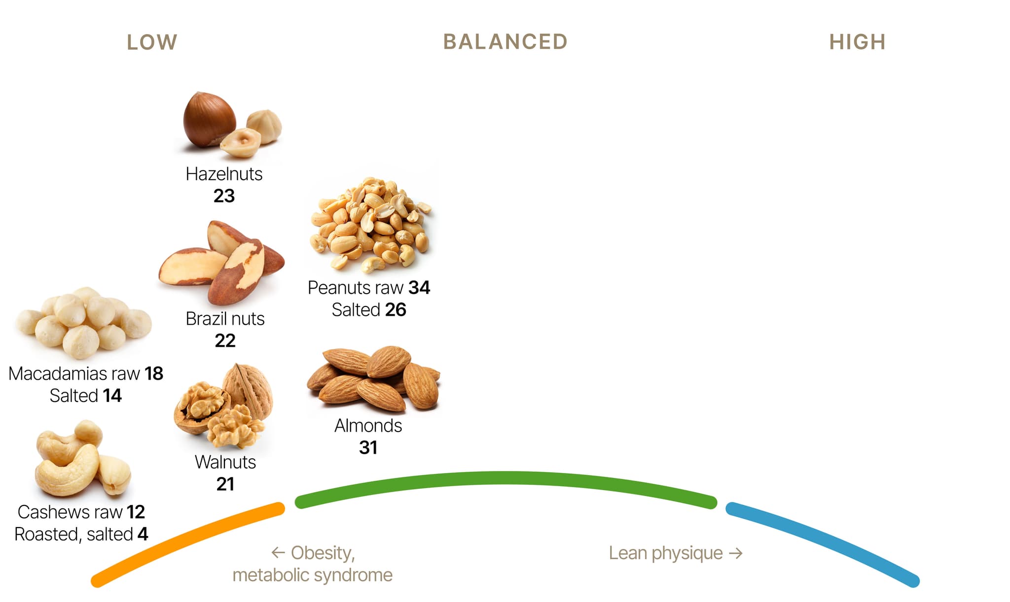 Salted cashews score a super-low 4, and macadamia nuts are not far behind at 18.