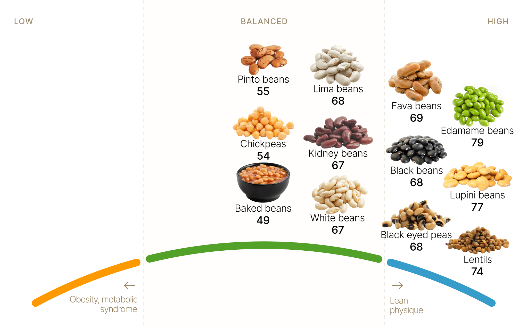 From the top, we find edamame beans at 79, and lupini beans at 77. My personal favorite, black beans, follow at 68.