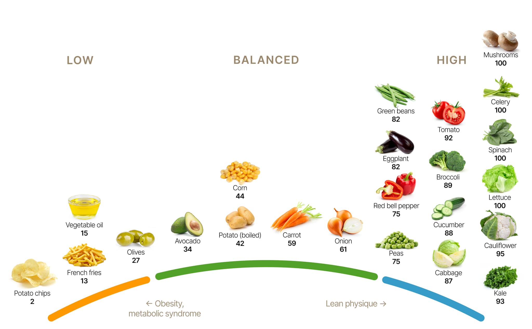 As you can see, most vegetables growing above ground are in the high range, with satiety scores of 70 or higher.