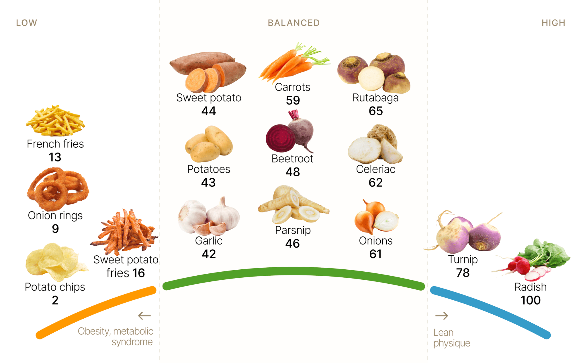 Root vegetables – growing below ground – tend to be in the balanced center section with scores in the 40-70 range.